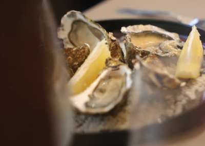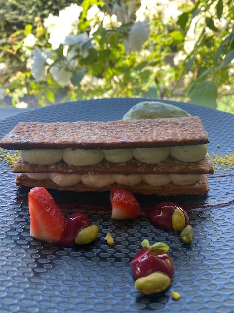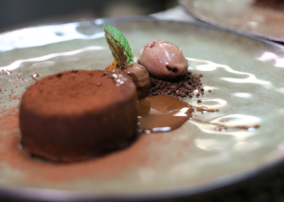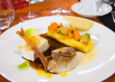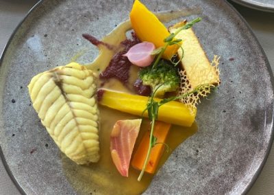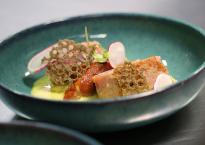 Spécialisé dans les poissons et fruits de mer, le restaurant « Au Jardin des Sens » s’approvisionne auprès des producteurs locaux. Au gré des saisons, les déclinaisons terre, mer enrichissent les menus : Quasi de veau, Tataki de Thon et sa crème Onctueuse de Wasabi, complètent agréablement la cuisine de la mer proposée par le Chef .