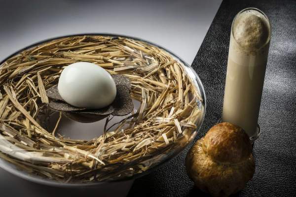 ▪️L’oeuf poule « Carrus » pourri de truffes mélanosporum sur une purée de champignons et truffes, briochine tiède et capuccino à boire.