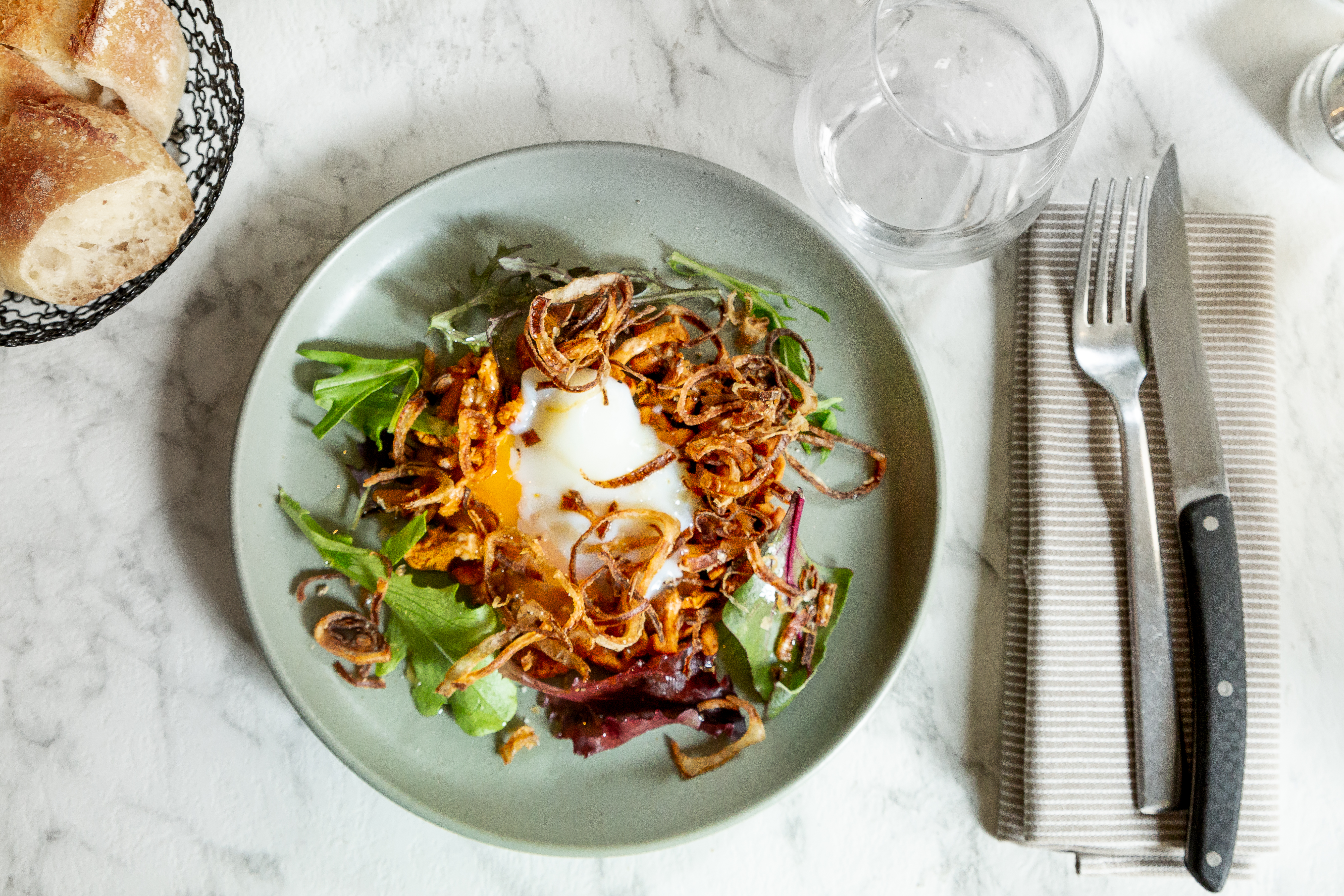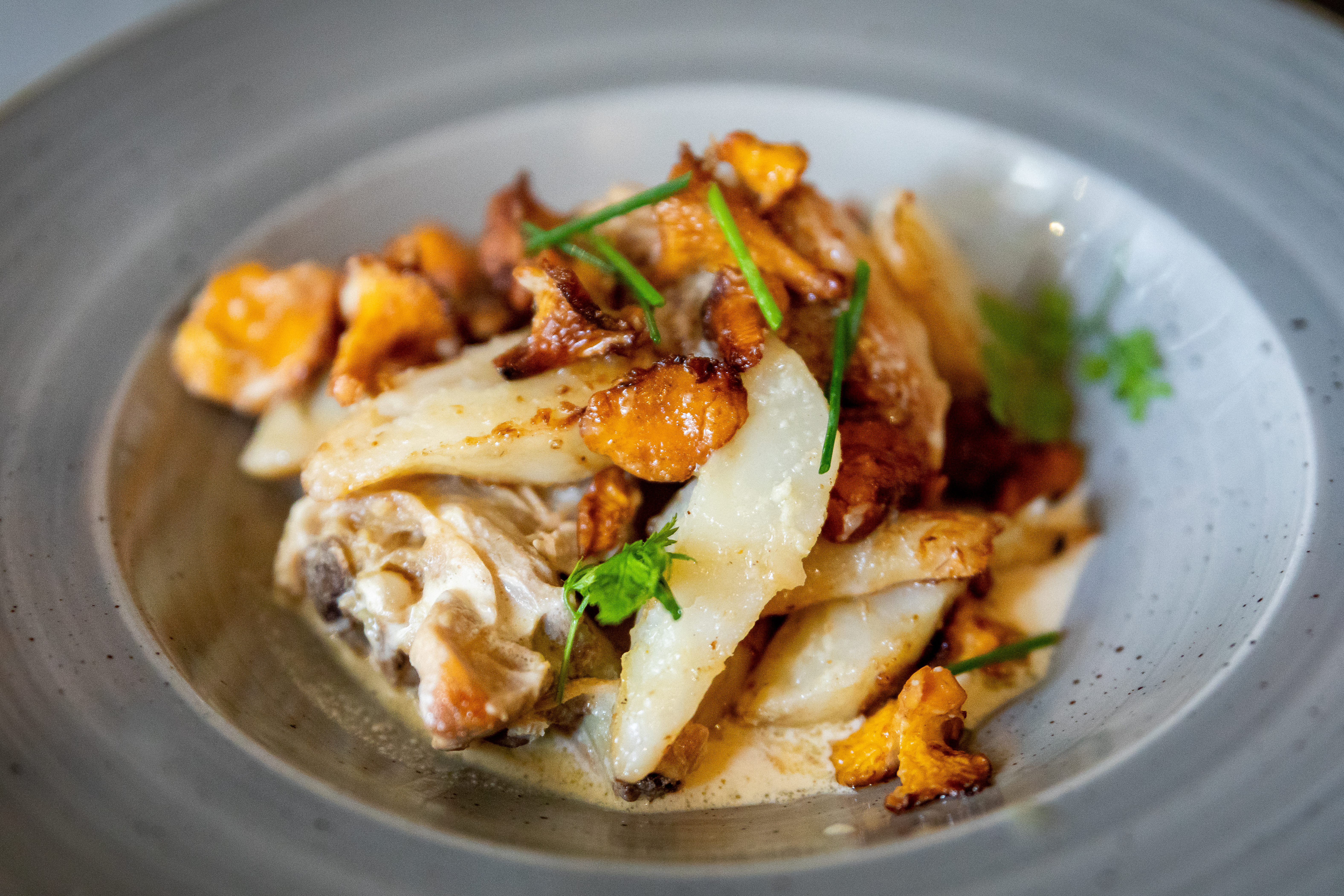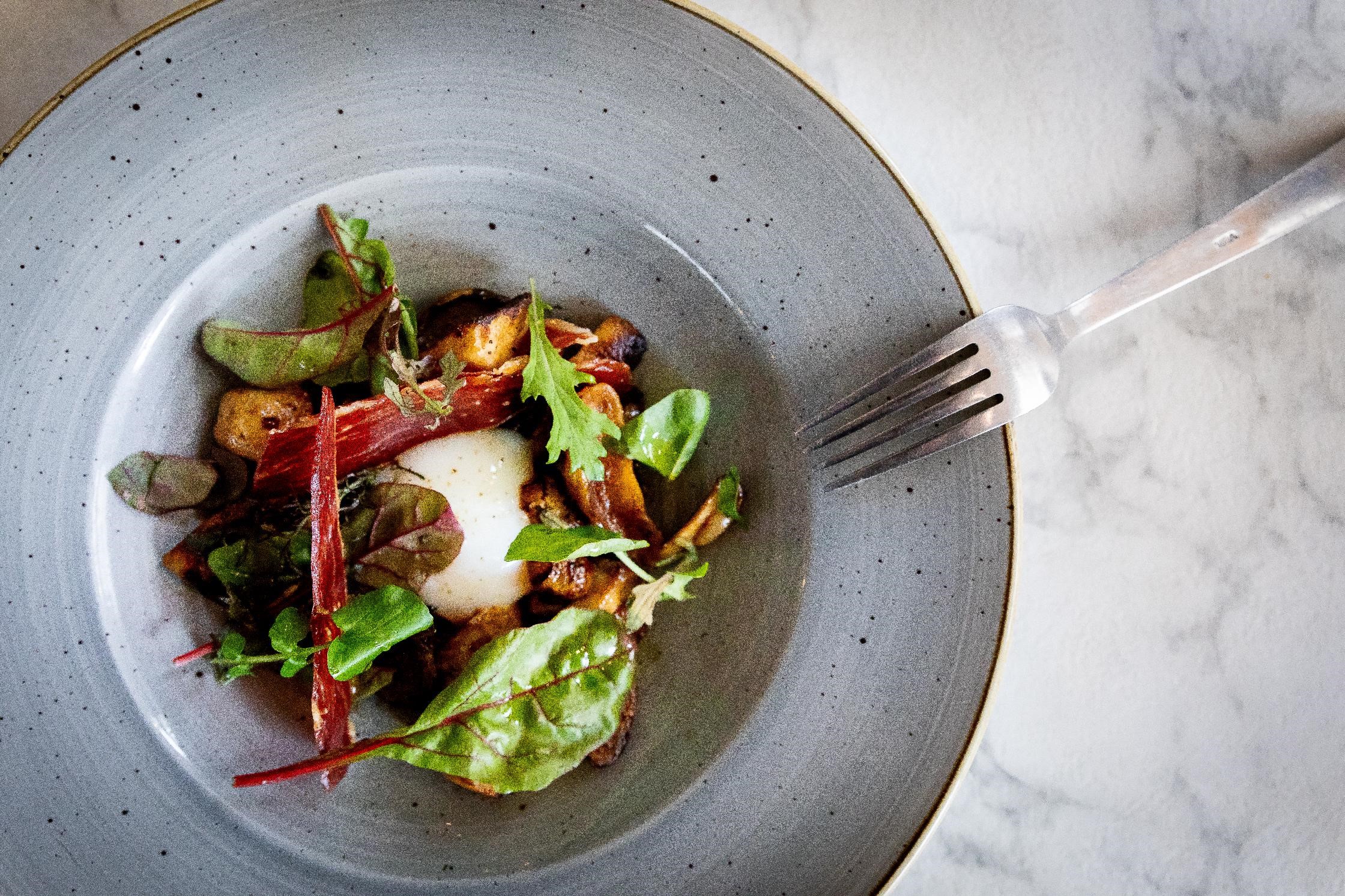 Fricassée de champignons des bois, œuf parfait, jambon crispy