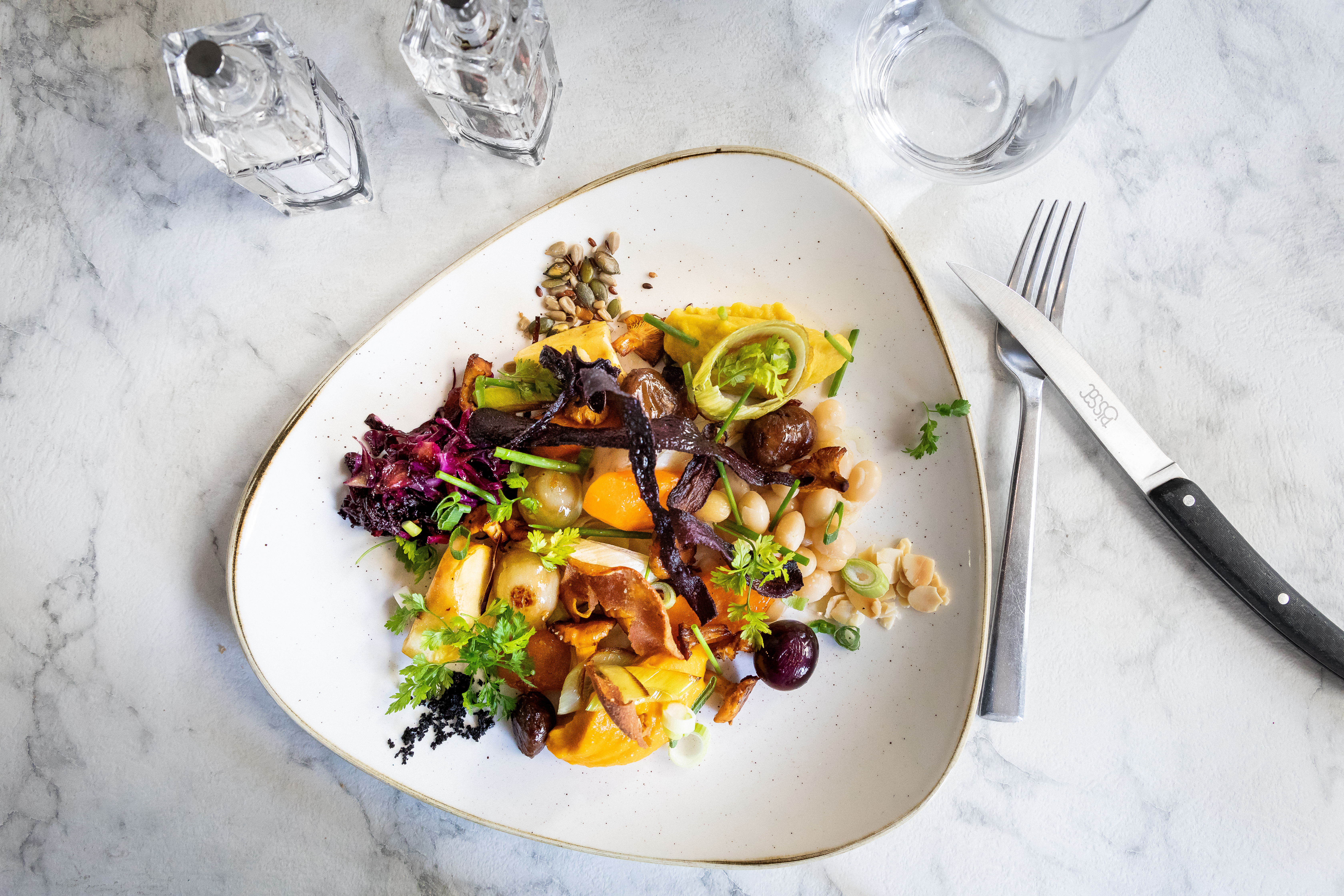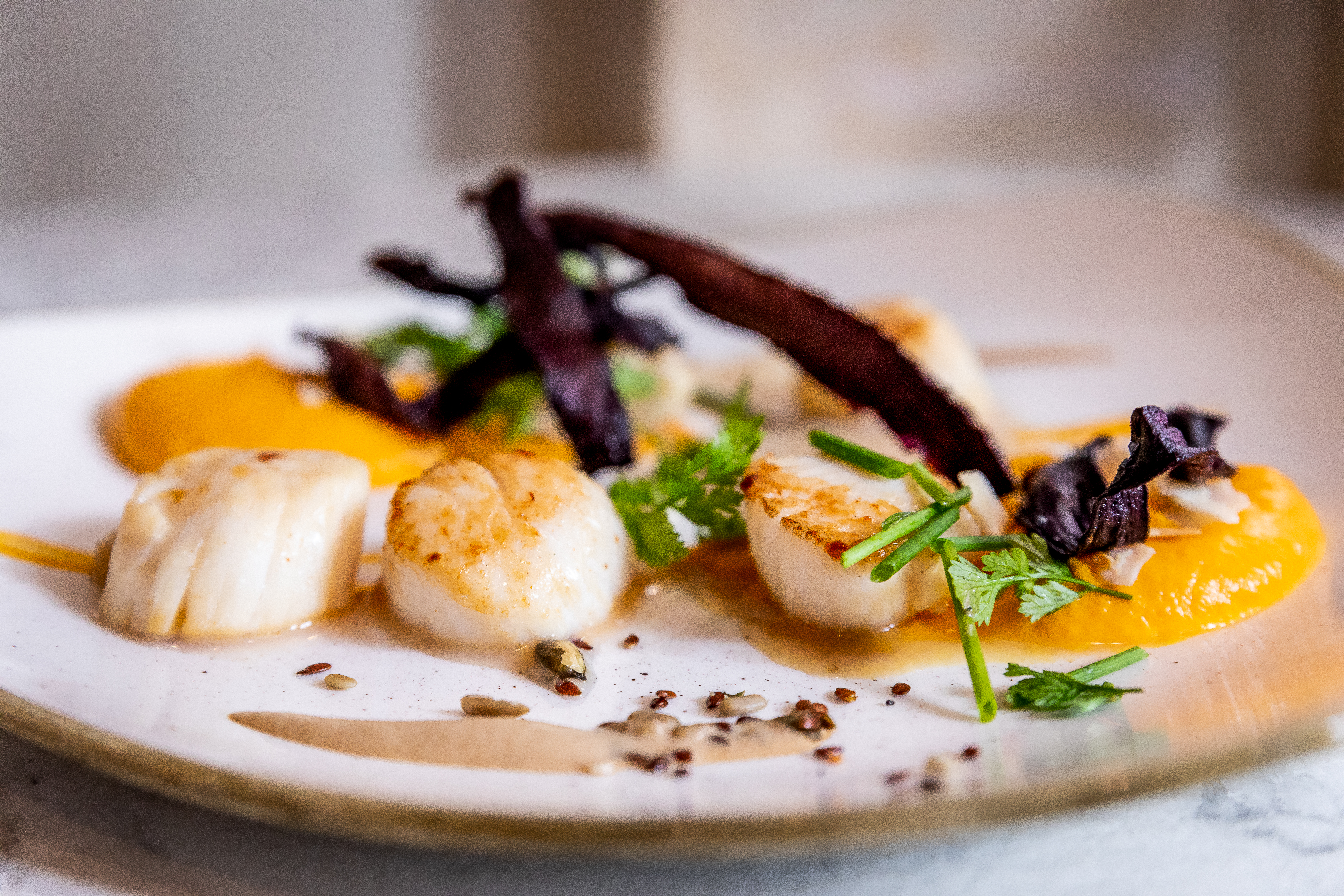 Noix de Saint-Jacques snackées, mousseline de potimarron, nuage de café, noisettes torréfiées