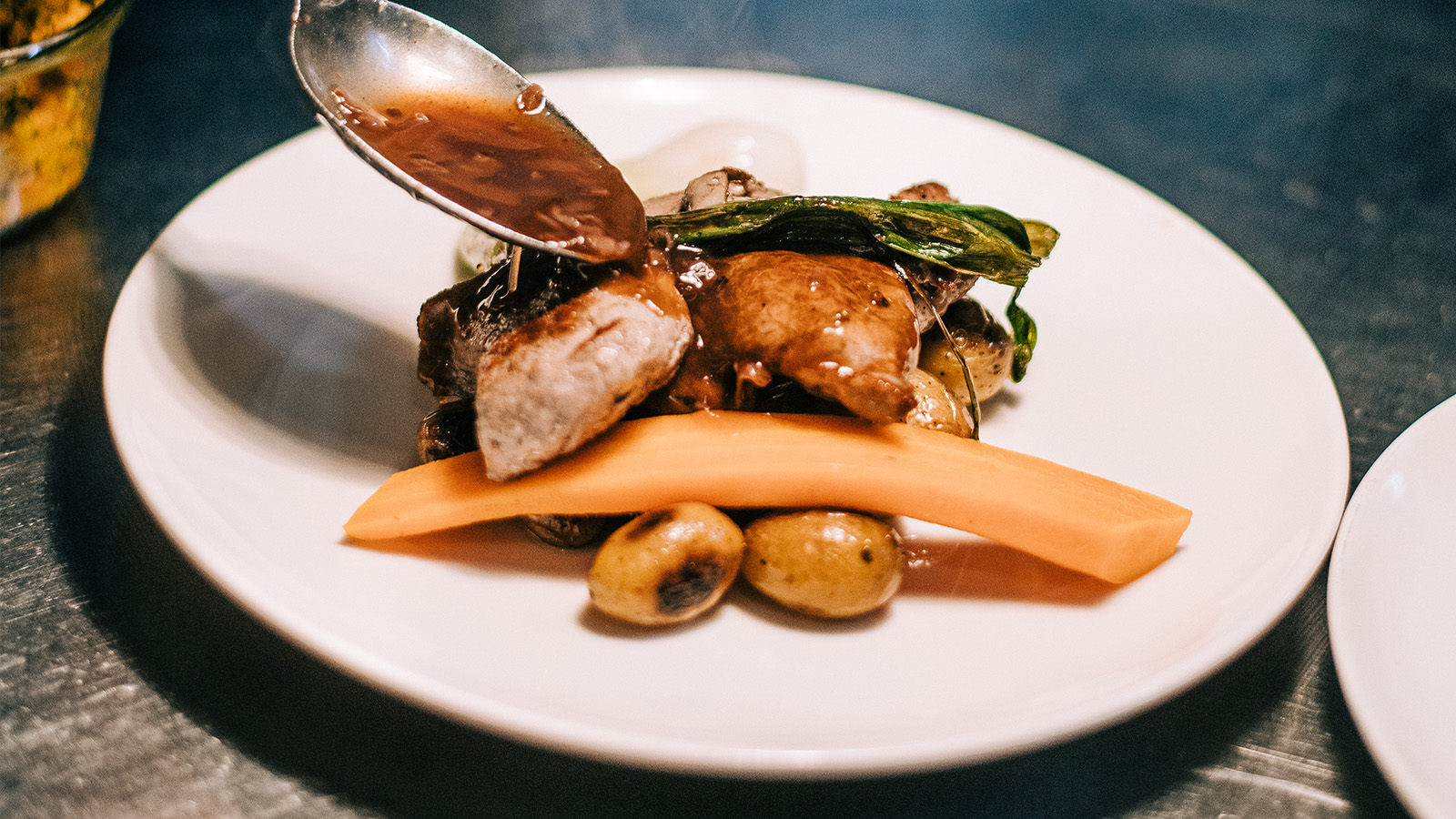La Poitrine de cochon de la ferme de Challonges confite et rôtie, bon jus réduit