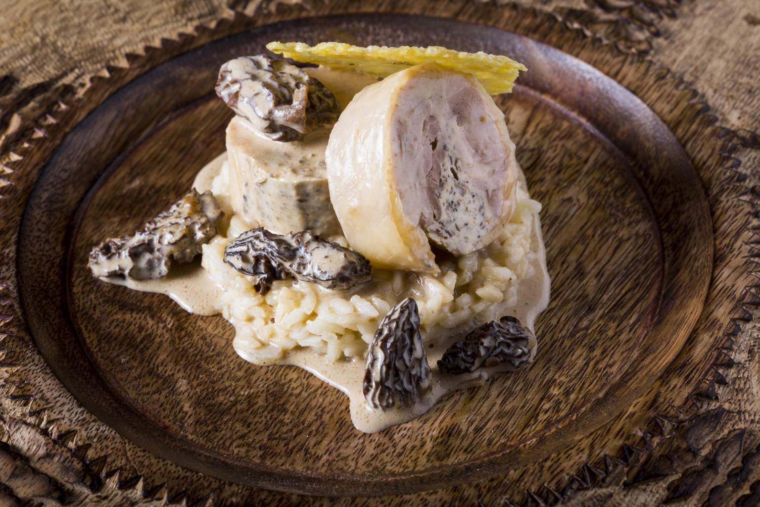 La poularde de Bresse au Vin Jaune et Morilles demeure une tradition dans notre maison depuis plus de 35ans améliorée au fur et à mesure que le temps passe au grès de l'évolution de la cuisine, entièrement désossée et cuite en ballotine pour votre plaisir gustatif.