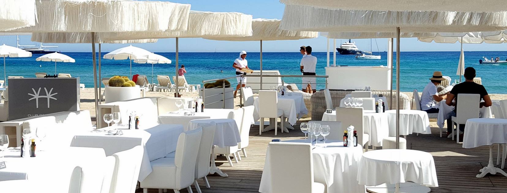 Accueil personnalisé, décoration chic et élégante, service irréprochable. Cuisine méditerranéenne. L'adresse exclusive de la baie de Pampelonne. Service limousine. Navette bateau. Boutique - Navette bateau - Service limousine