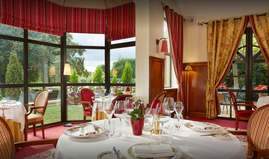 Né en Juin 2006, c’est un cadre spacieux, décoré dans l’esprit de la maison, comme une continuité du bar que l’on traverse pour y accéder ; de style traditionnel, on y retrouve une jolie cheminée pour habiller la première pièce, des boiseries en merisier, de beaux tissus flamboyants rouges et jaunes, luminaires majestueux, et enfin un large bow-window donnant sur le magnifique jardin paysager et ses jets d’eau.