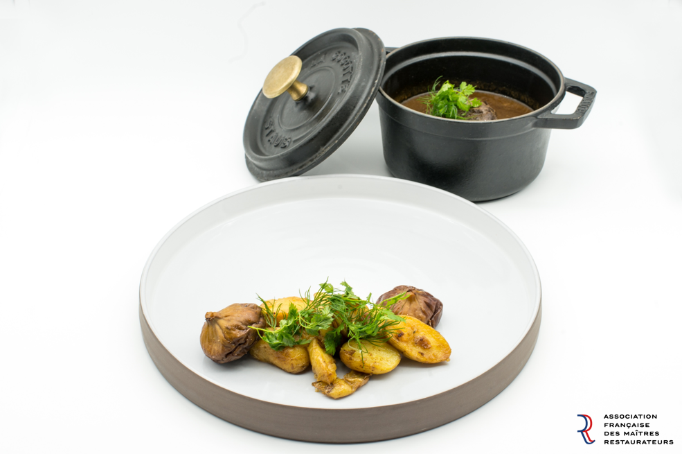 Joue de Boeuf confite, purée de Coings et poêlée de Girolles