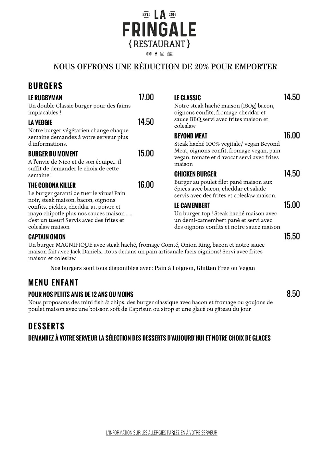 La clé de notre succès est simple: fournir des aliments de qualité constante et savoureux. Nous sommes fiers de servir à nos clients de délicieux plats authentiques comme nos burgers bistronomique, des fish & chips, poison ou viande.