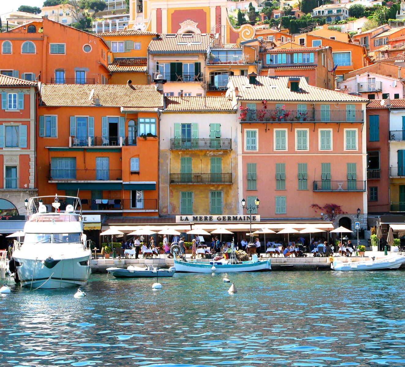 Chez Germaine, on prend place, tel un hôte choyé avec, dans l’esprit, le privilège de succéder à d’illustres prédécesseurs. L’établissement est unique en son genre. Situé seulement à quelques mètres de la mer, ou dansent mollement des barques de pêcheurs, à quelques encablures des yachts les plus prestigieux. On y vient aussi bien par mer que par voie terrestre. L’été, la Rade de Villefranche est constellée de navires de plaisance battant tous les pavillons et l’on débarque directement devant “LA MERE GERMAINE” dans la joie et la perspective d’un bon repas.