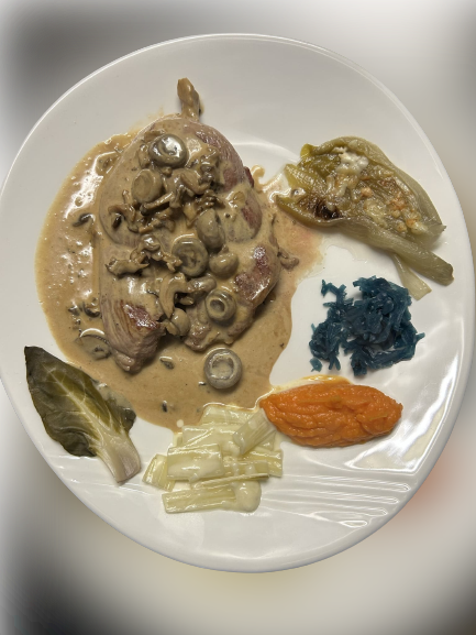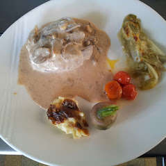 Tranche de Gigot d'Agneau de Savoie nappée d'une sauce aux Pleurotes de Savoie élaborée par Eric JACQUET Maître Restaurateur