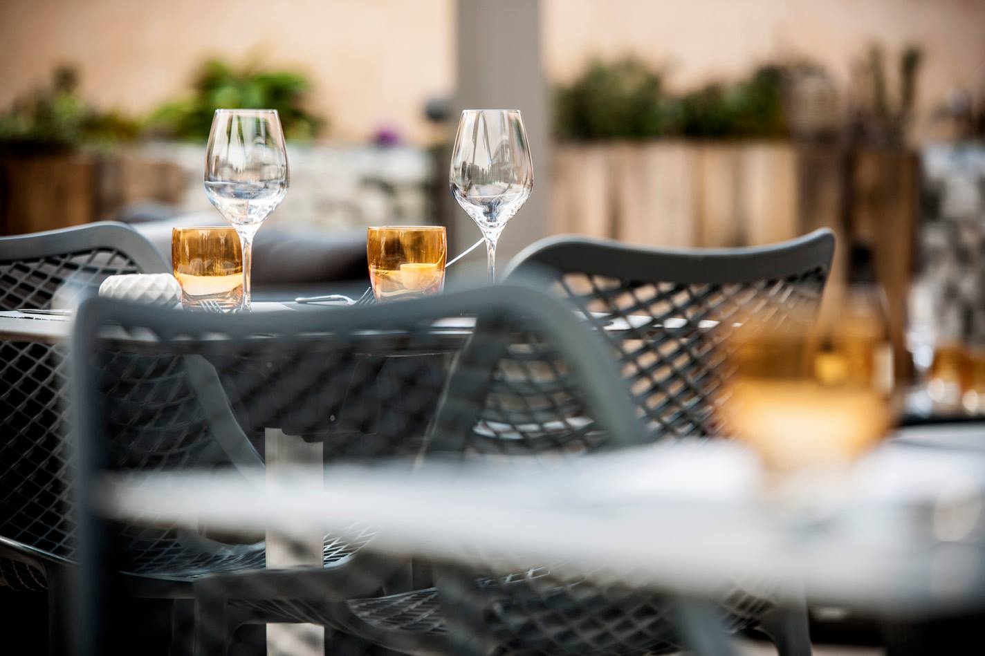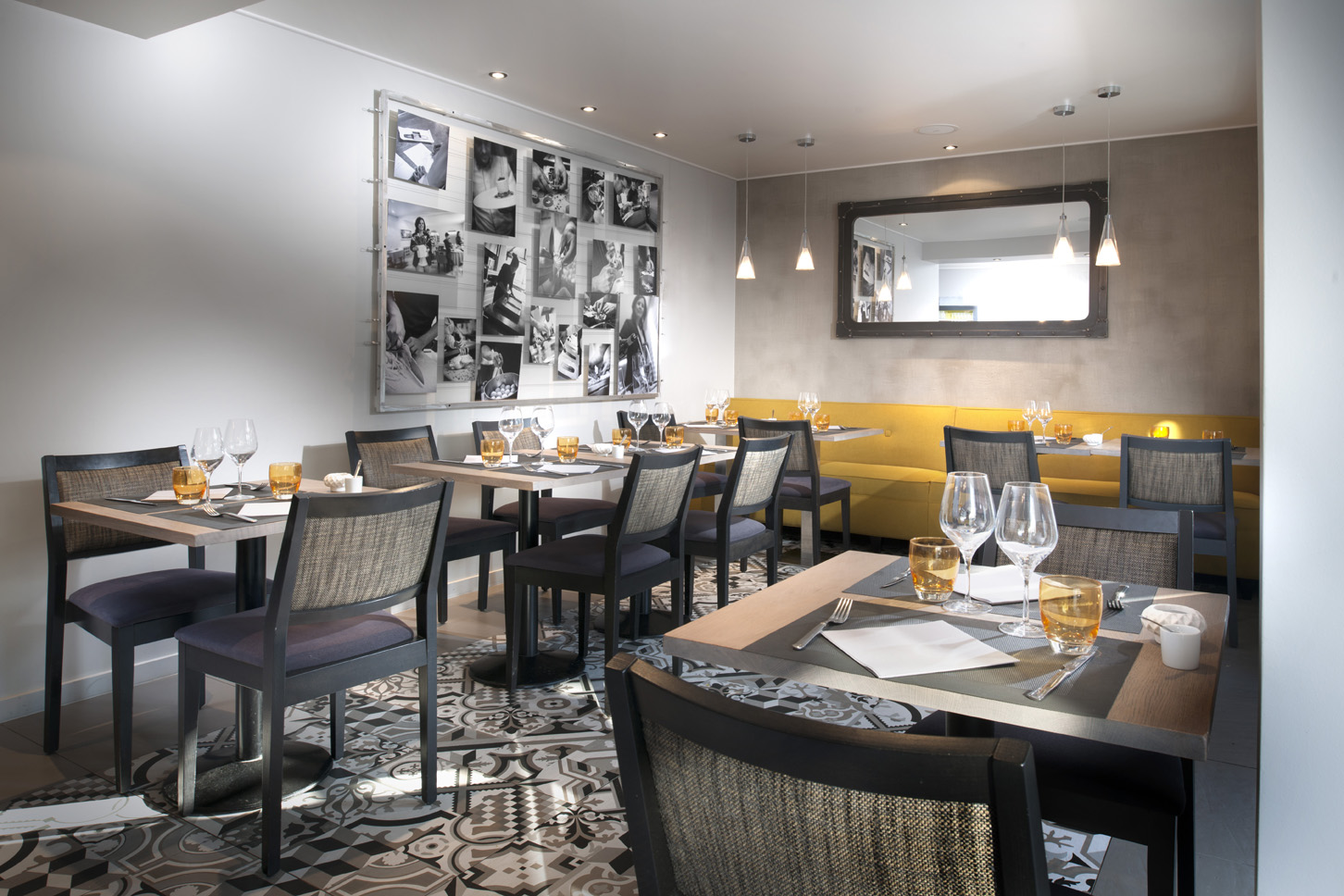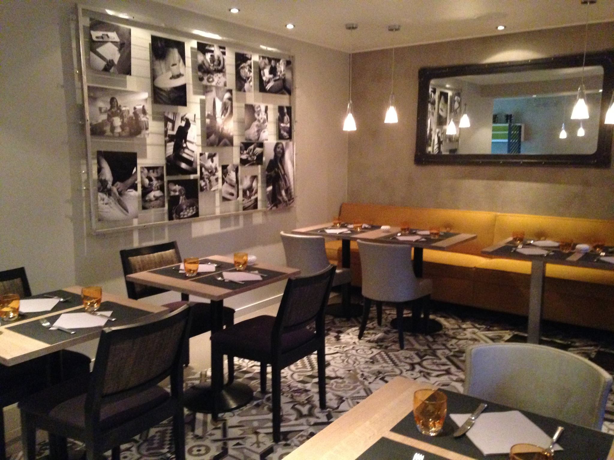 Brasserie fine & chic. Terrasse calme et ombragée en plein cœur de la ville. Mets faits maison variant tous les quinze jours pour ceux à la carte. Mise en avant de l’équipe et de leurs savoir-faire sur un mur d’image consacré au beau geste professionnel.