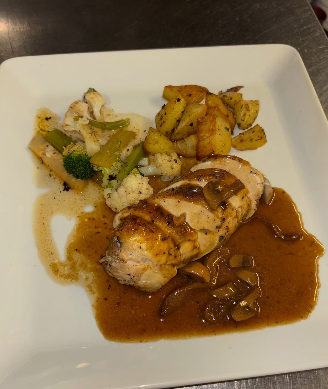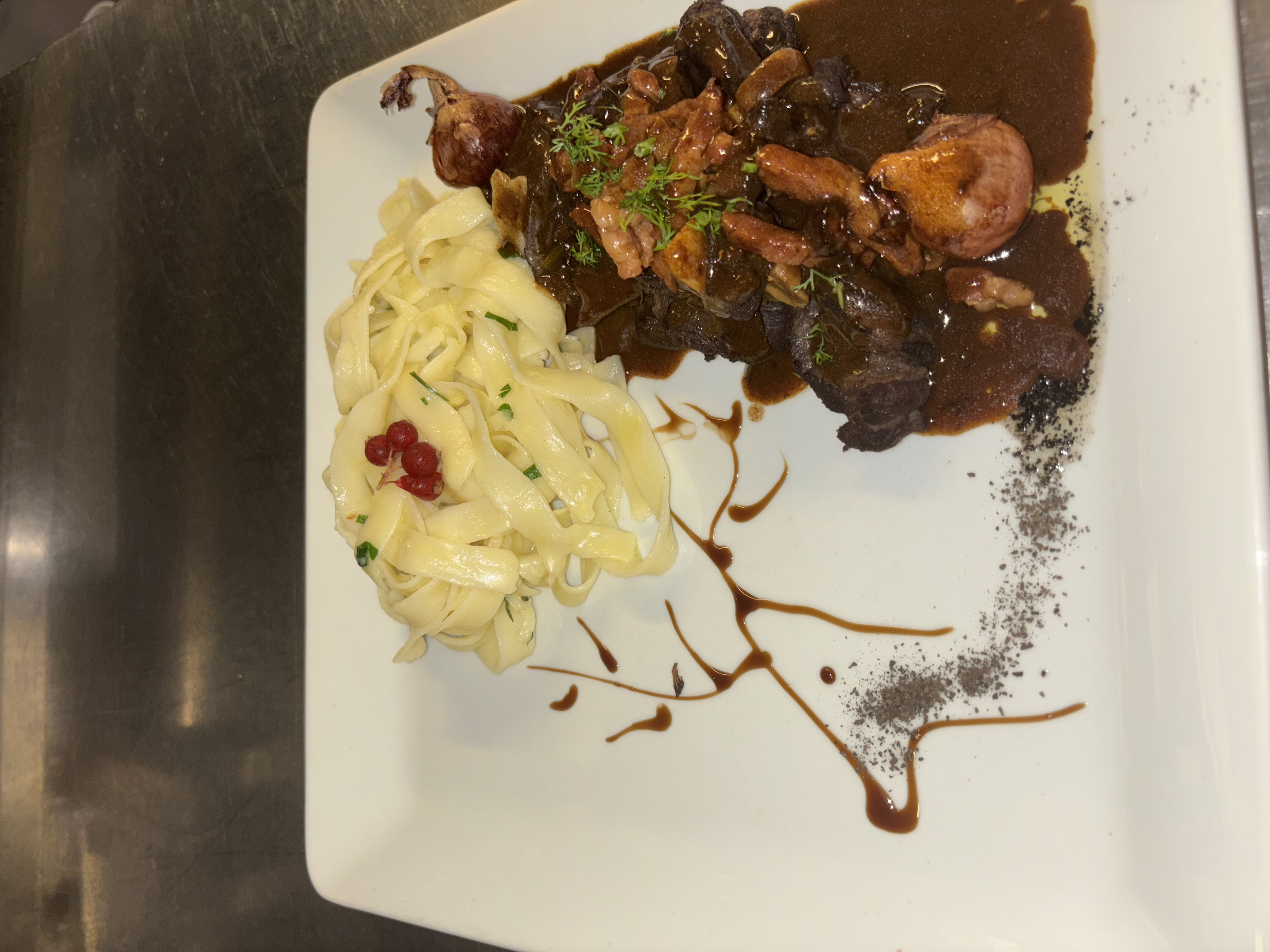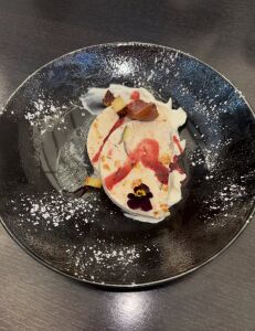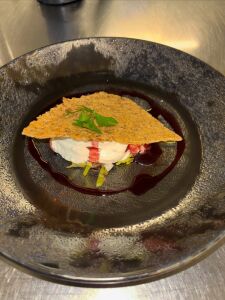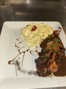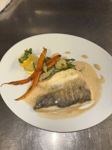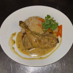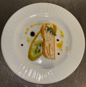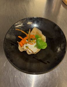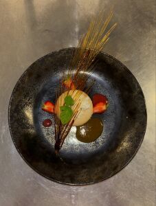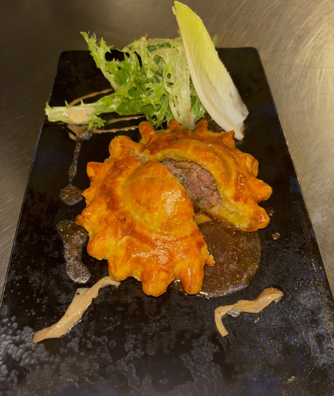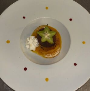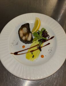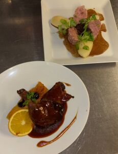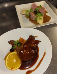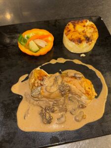 Poitrine de Veau roulée, farcie au ris de Veau, cuite en basse température, jus réduit à la sauge.