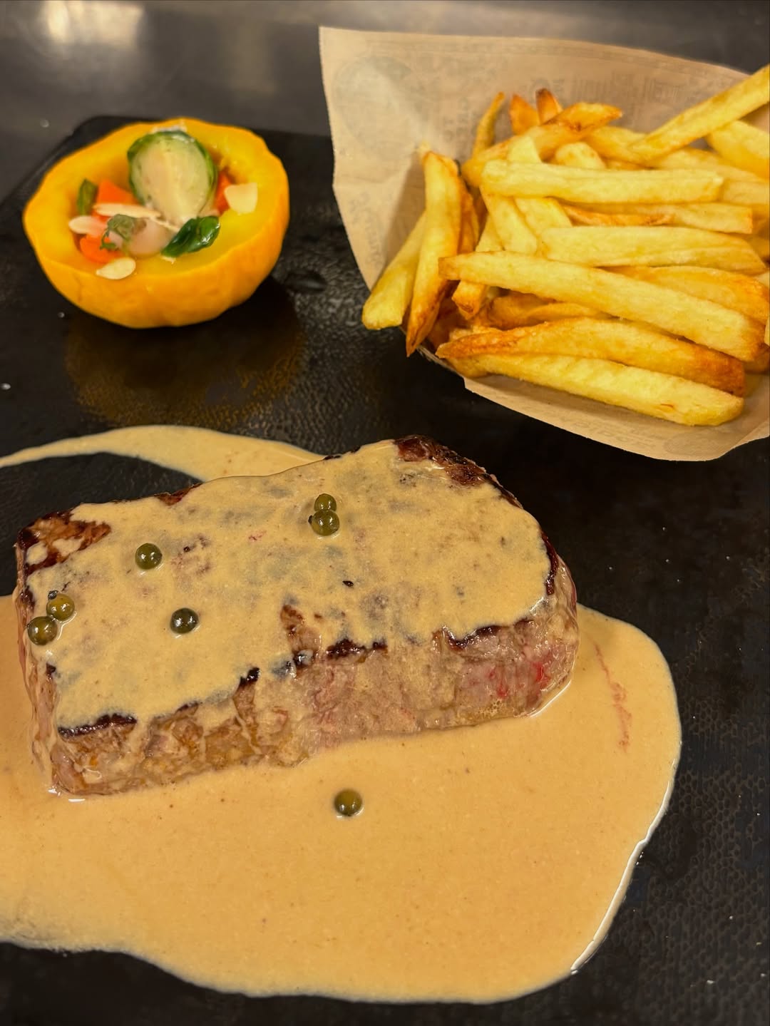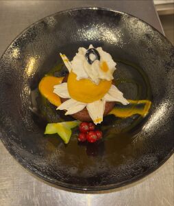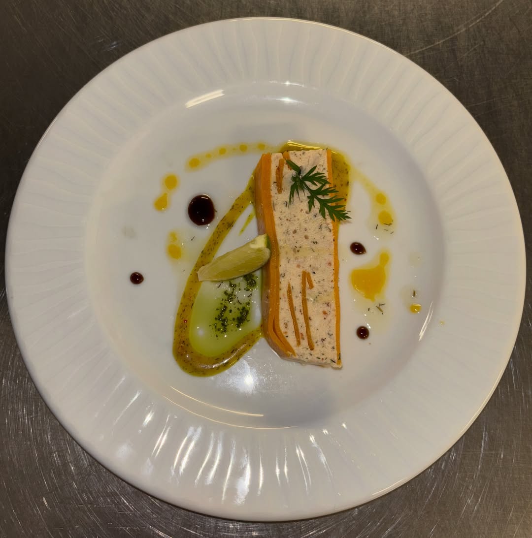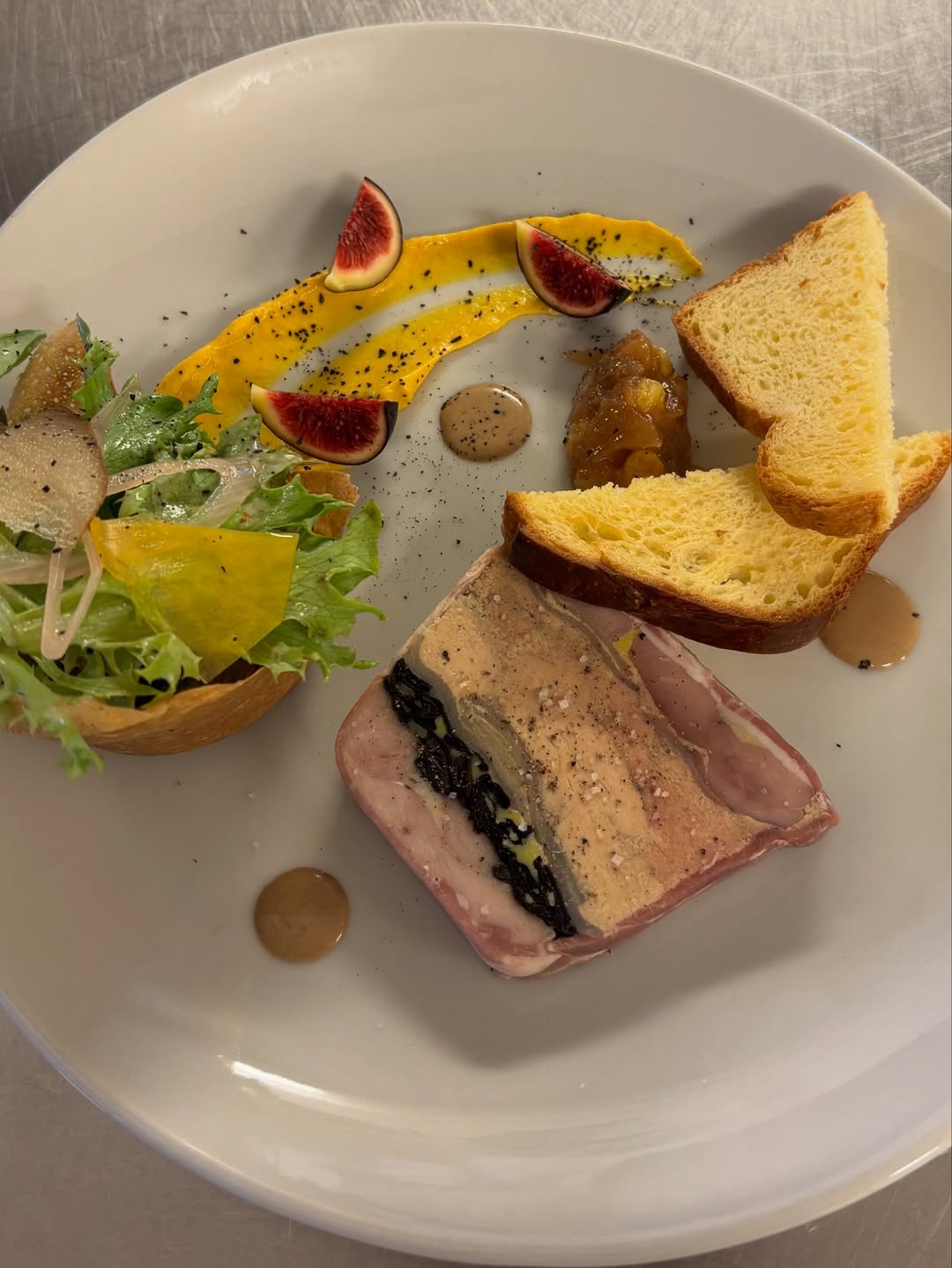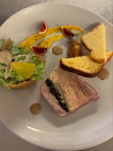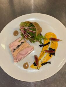 Foie Gras IGP et pintade, pressé aux trompettes.