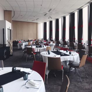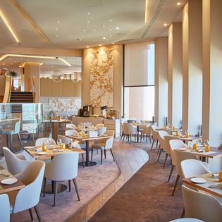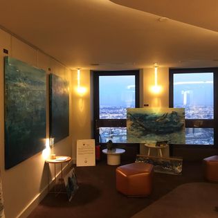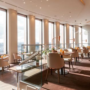 Restaurant gastronomique raffiné sur un toit avec vue sur la ville servant des plats à base de produits locaux et des cocktails