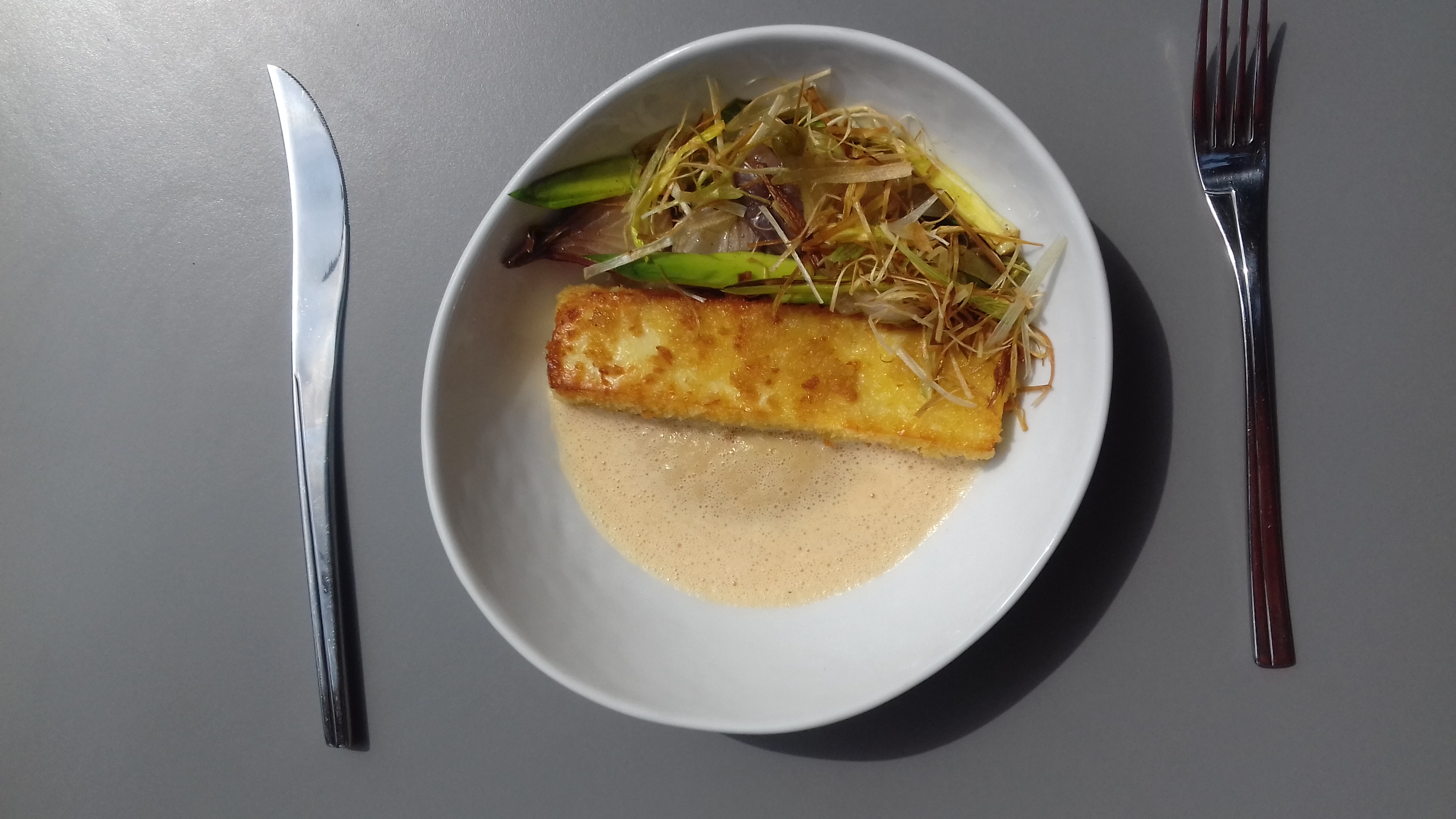 Filet de bar rôti à la plancha, risotto aux asperges vertes et condiments d’huile vierge