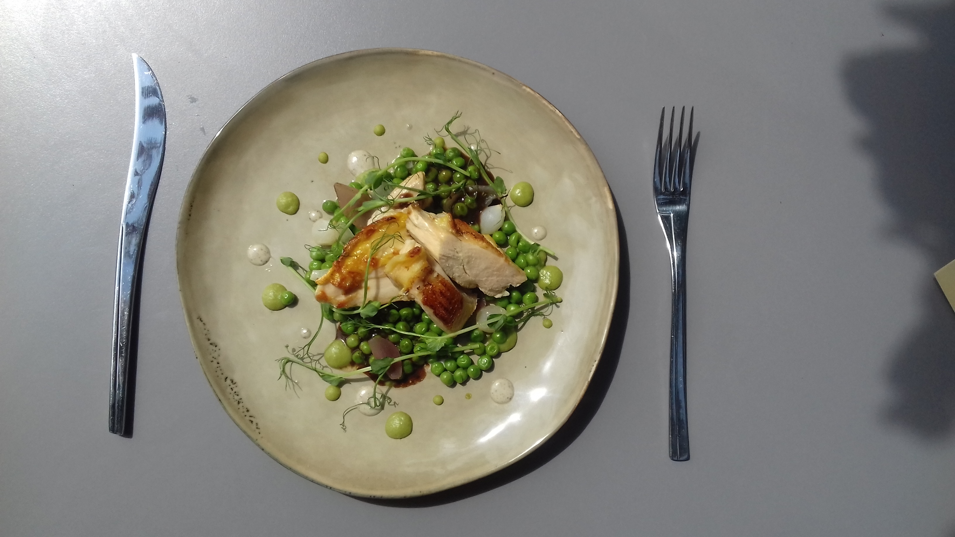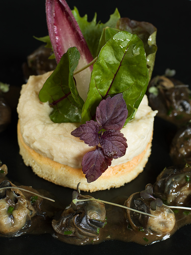 Tournedos de poulet à la noisette, sauté de petit pois et oignons rouges, sauce morilles
