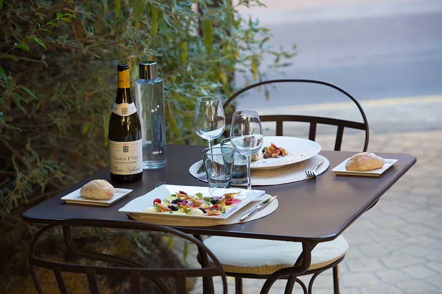 En arrivant au restaurant Le Rabelais, en plein coeur de St Chamas, vous serez tout d’abord accueilli par son enseigne en fer forgé posée en drapeau sur le façade, puis par la végétation luxuriante de ses lauriers, pins et oliviers débordant de la terrasse pour recouvrir, envahissants, les murs en pierres qui encadrent son portail.