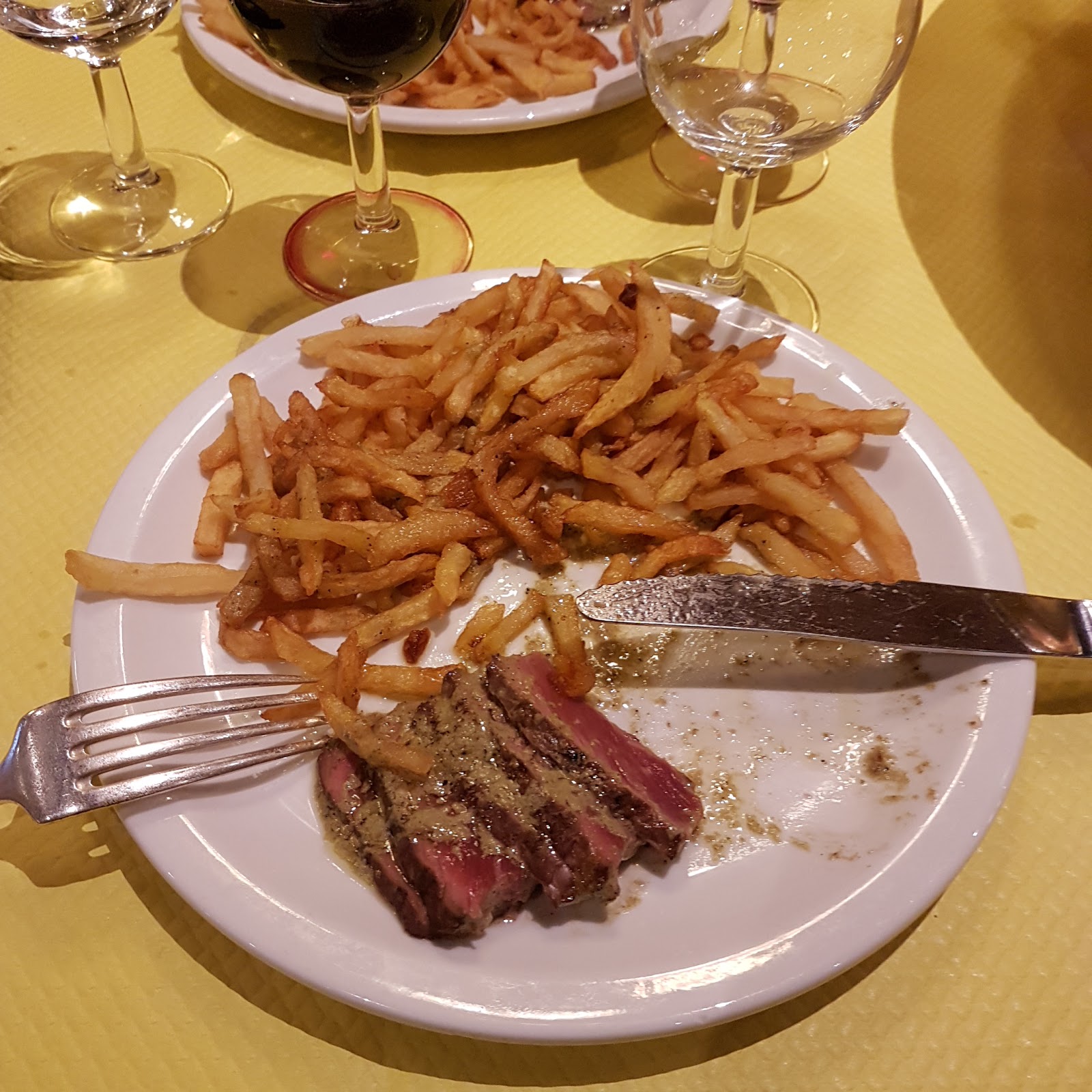 On vient apprécier la formule unique inchangée depuis plus de 50 ans : salade aux noix, faux-filet paré finement coupé (tranche de viande de bœuf de 170 grammes) accompagné de sa fameuse sauce à la composition gardée secrète, frites maison à volonté, pour finir sur un dessert élaboré par nos pâtissiers.