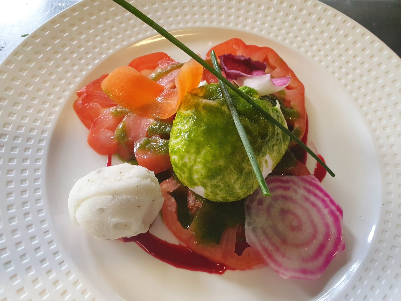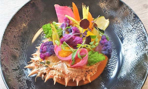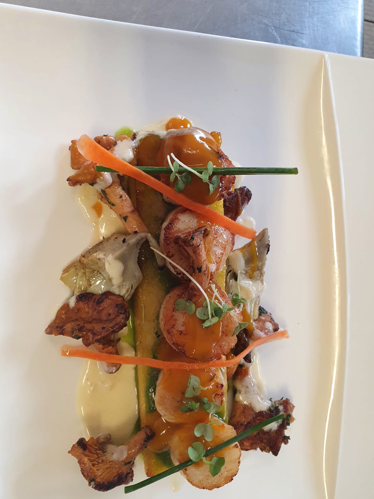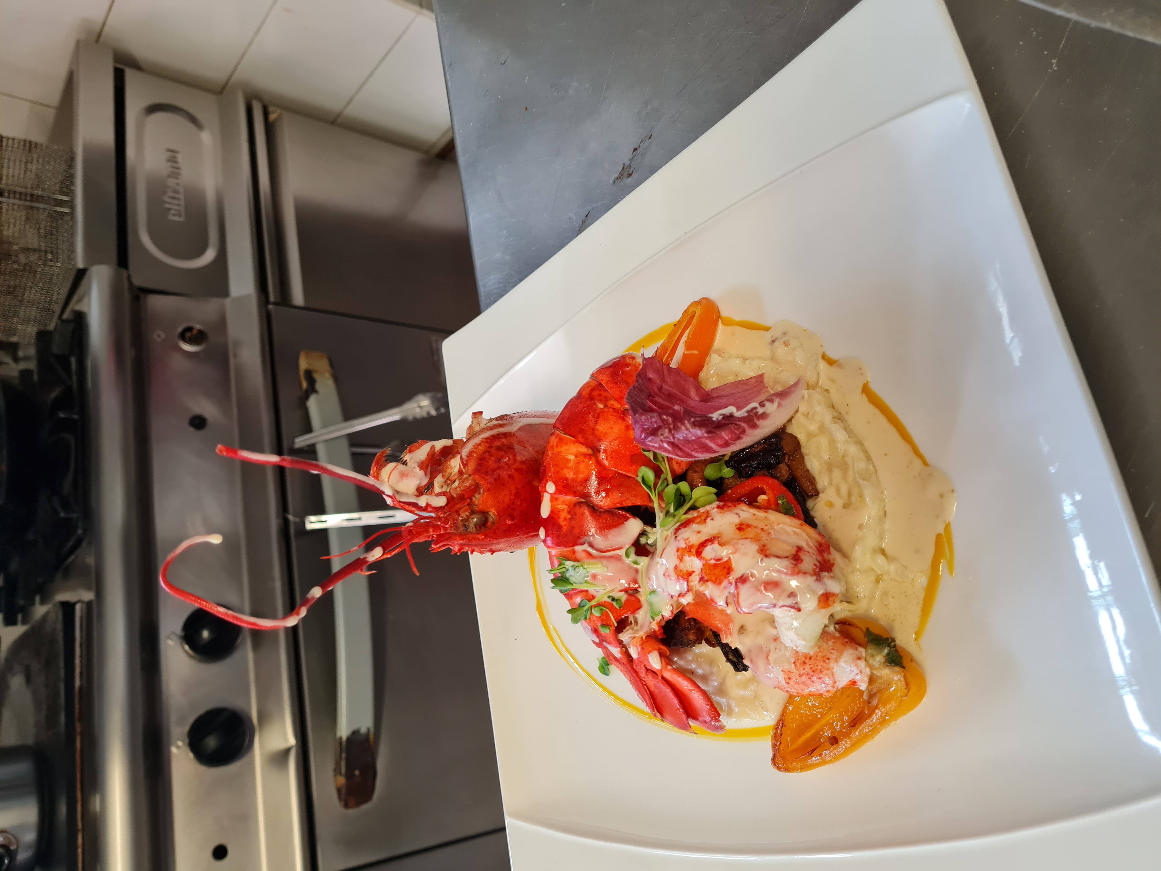 Le Hômard rôti et son sabayon au champagne, cebette et aubergines grillées.
