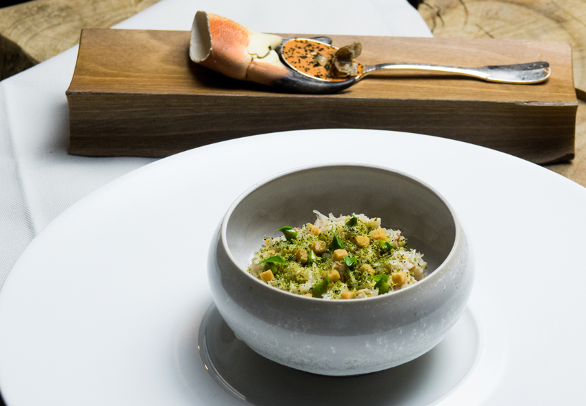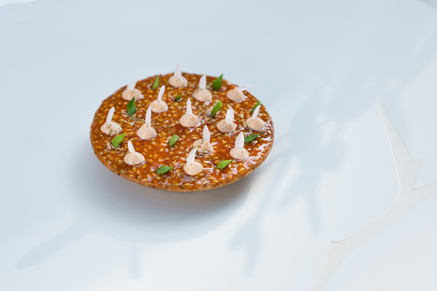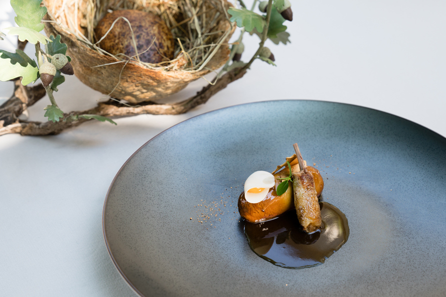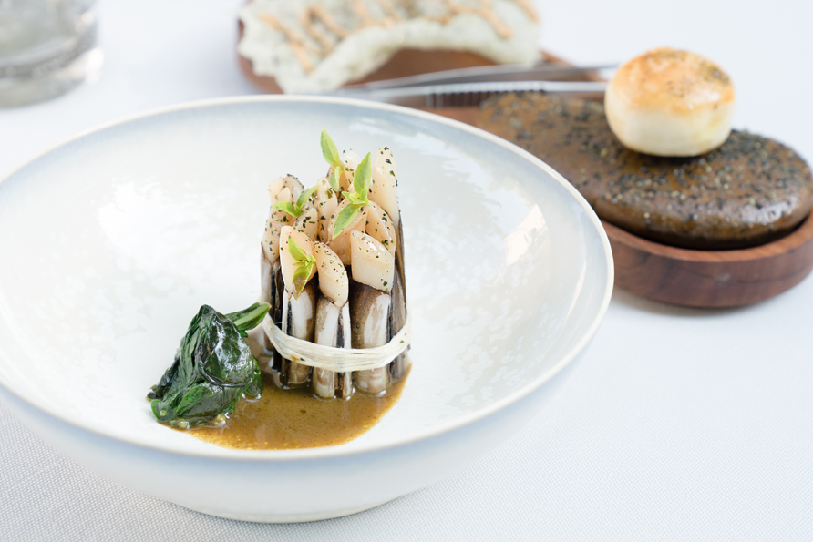 ROUGET DE ROCHE AGRAFÉ, chou cuit à l’anchois fumé, pain enrichi d’une sauce corsée au vin rouge