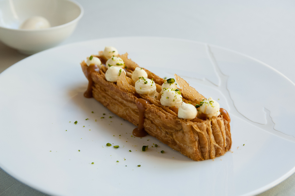 LE MILLEFEUILLE TRADITION BAUMANIÈRE, crème légère à la vanille de Madagascar, florentine pistache et glace vanille