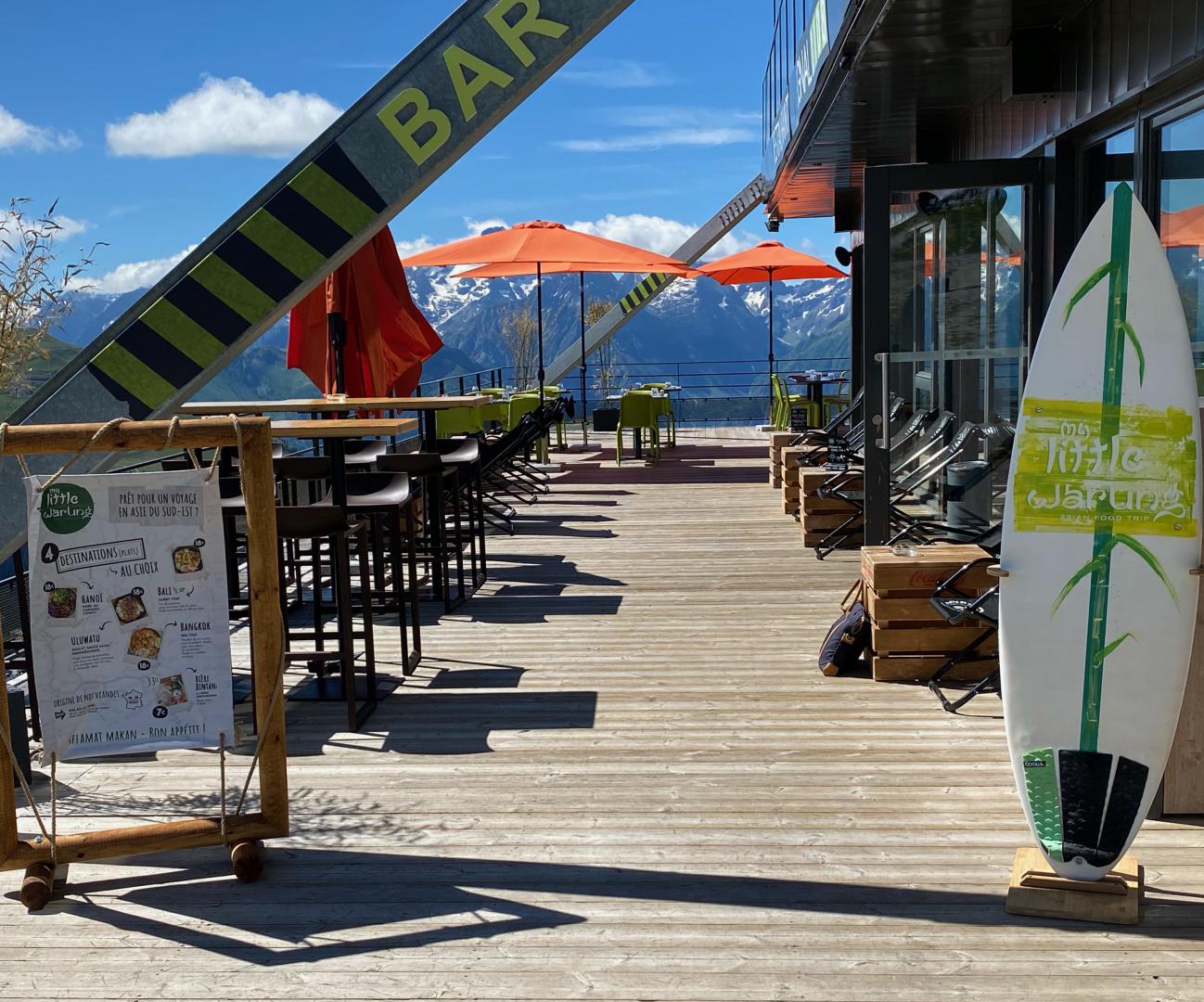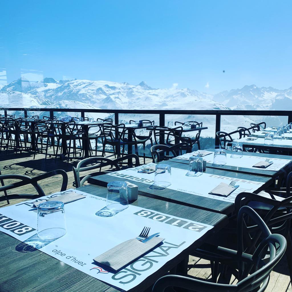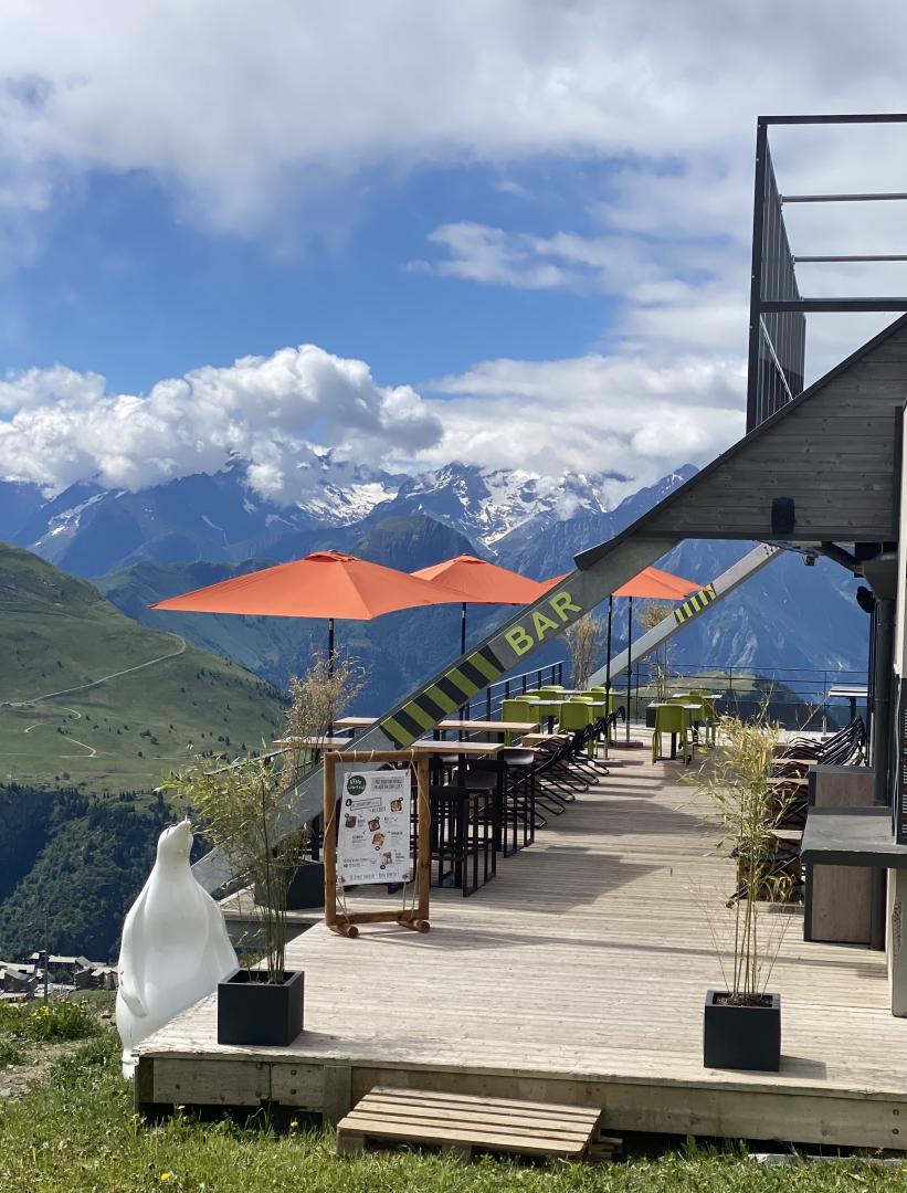 Le Signal, véritable phare de la station, est illuminé sous le sommet en toile tendue et bénéficie d'une vue unique sur l'Alpe d'Huez et les massifs alentours.