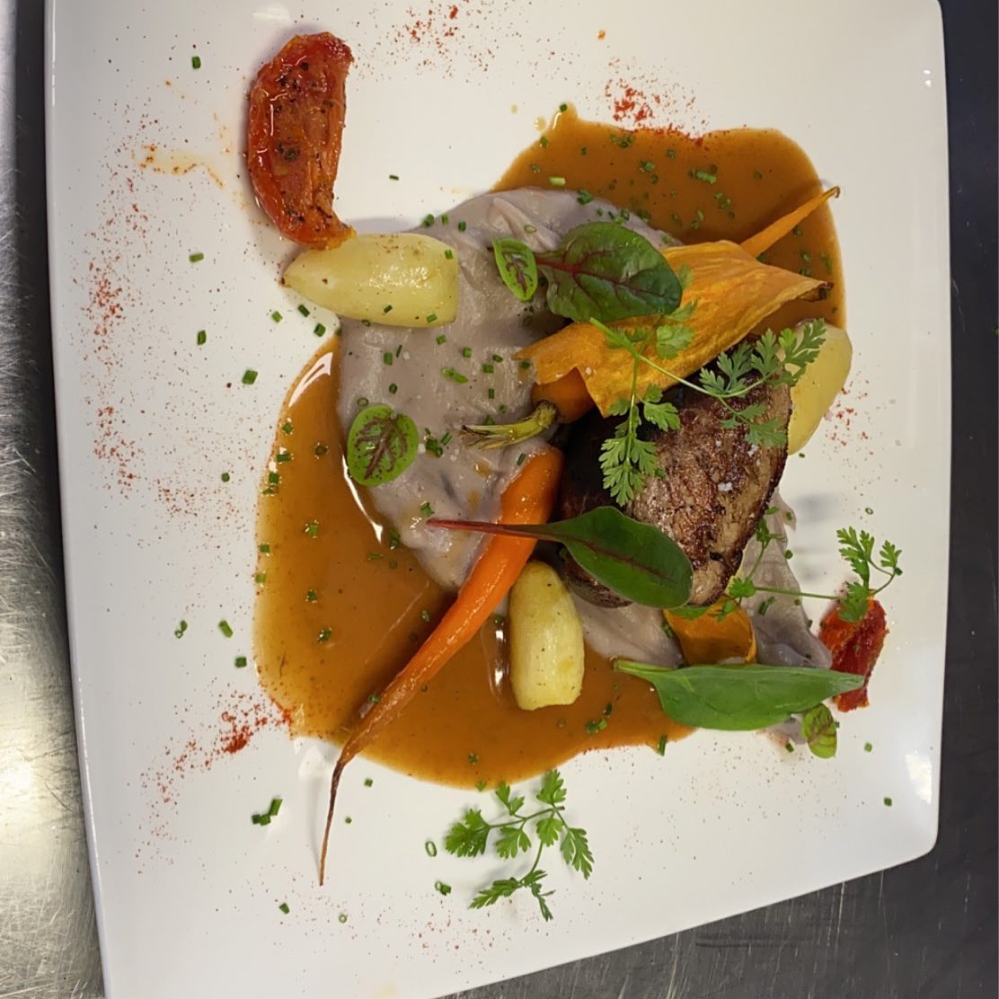 Une carte raffinée élaborée par notre chef. Les fromages proviennent de la Fromagerie Les Alpages à Grenoble de Bernard Mure-Ravaud, MOF et champion du monde d'affinage. Une attention particulière a été portée à la présentation des plats.